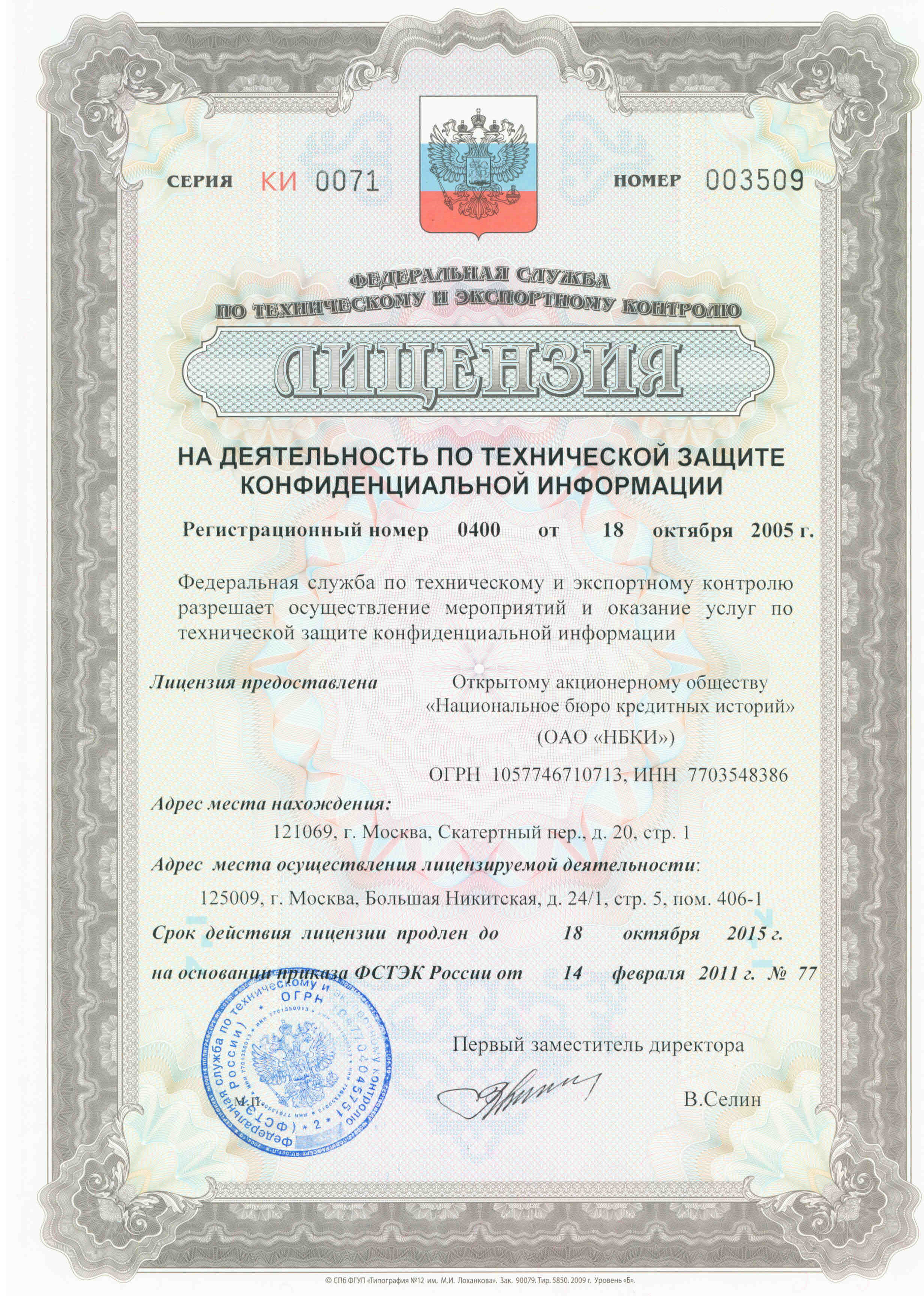ОАО «НБКИ» имеет лицензию Федеральной службы по техническому и экспертному контролю на деятельность по технической защите конфиденциальной информации (серия КИ 0071 № 003509, регистрационный номер 0400 от 18 октября 2005 года).